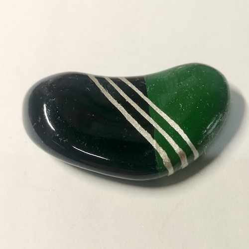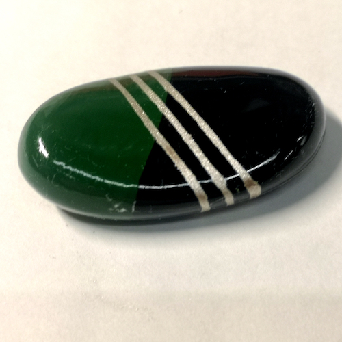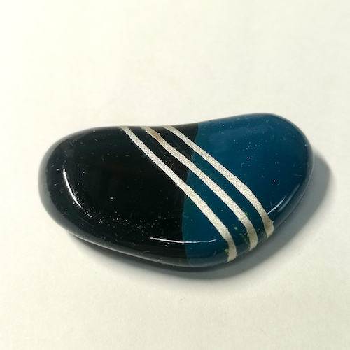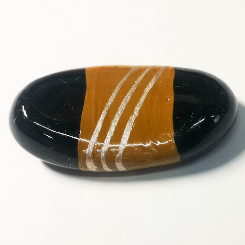 丸石形の樹脂に黒漆を塗り、色漆でアクセントをつけた箸置きです。色は「青」「緑」「紫」「赤」「黄」の5種類です。ひとつひとつ形が違いますので、下の写真でお確かめの上、お選びになったものを、1つずつ「買い物かご」にお入れ下さい。現在の在庫は下の11個です。