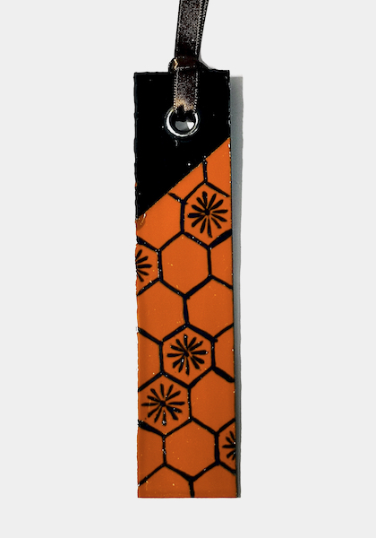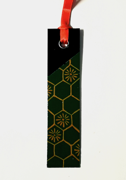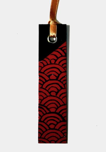 厚紙に、漆で下地を施し、黒漆を塗って、色漆で文様をつけた「しおり」(ブックマーク)です。文様は5種。読書のためのおしゃれなアクセサリーとして、軽いプレゼントにもいかがでしょうか。クリスタル・パック入りです。