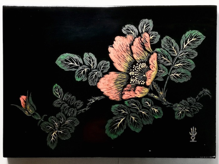 朱・黄・緑の色漆を塗り重ね、最後に黒漆を塗って磨き仕上げをしたパネルの面に、村上の市花でもある「はまなす」などの草花を彫った漆額です。