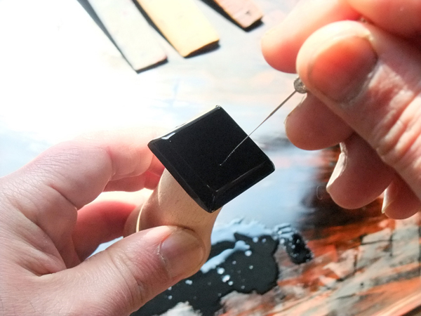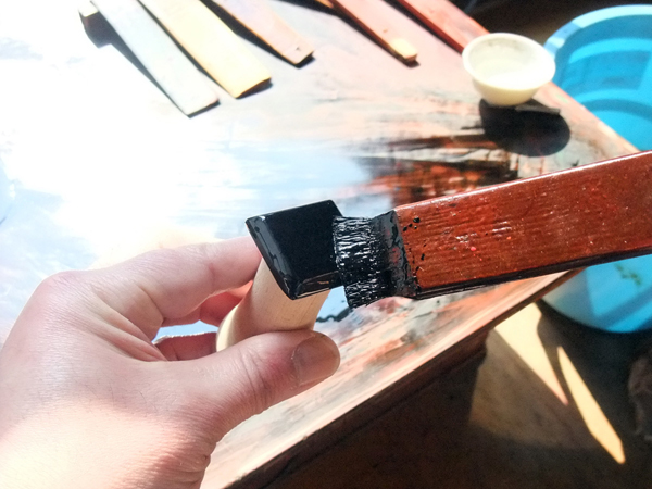 それはどのようにやるのかというと、漆をコンロにかけて、沸騰するまでぐつぐつ煮てつくった「焼き漆」と呼ばれるものを、何割か混ぜるのです。漆は沸騰させると、中のラッカーゼが死んでしまって全く乾かなくなり、この乾かない漆を混ぜることで、漆の乾きを遅くできるのです。(現在ぼくらは、漆屋さんが特種な方法で精製した「不乾燥」という漆を、焼き漆の代用として使っています。)