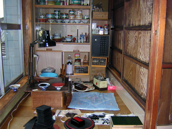 実際どのようにするかというと、電熱マットの上に水で濡らしたスポンジを敷いた「塗り風呂」という室(むろ)に、漆を塗ったものを入れ、中を密閉しておきます。乾きが悪い条件の日には、マットの電熱を入れ、スポンジの中の水分を蒸発させて、内部の湿度を高くするのです。この塗り風呂は、漆塗り職人の仕事部屋には必ず備え付けられていますが、塗るものが小さいものであれば、段ボールや衣装ケースなどで代用することも可能です。