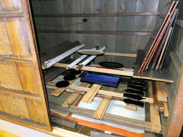 このように、大まかにいって、シャープでくっきりとした艶が出したければ「呂色」、やわらかでしっとりした半艶やマットな感じが出したければ「塗り立て」を行うわけですが、それとは別に、「塗り立て」はあまり大きなものには向かないということもあります。大きなものは、どうしても埃がつきやすく、また乾燥ムロの中で一定時間ごとに回転させて均一に乾かすということも困難だからです。