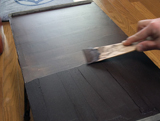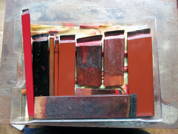 刷毛屋さんは、それを洗い、束ねて糊漆で固め、4枚のヒノキの板で挟んで仕上げ、ぼくら漆職人は、それに和紙や布を巻き、漆を塗ってから使用します。それは、毛にしみこんだ油が、刷毛の持ち手の部分に染み出さないようにするためなんですね。