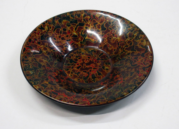 また、塗り上げた漆の面に同じように線を彫ったあと、全面に色漆を塗り、木炭で研ぎ出すと、彫った線の部分にだけ色が残る、つまり彫った溝に色漆を埋めるという技法があり、これを「蒟醤」(きんま)と言います。多色を使うには、それぞれの色ごとに充填や研ぎを繰り返す必要があり、たいへんな手間がかかりますが、繊細な美しい表現が可能です。元々は、ミャンマーなど東南アジアで行われている技法なのですが、日本では、高松など香川漆器の代表として定着しています。なお香川漆器にはもうひとつ、何層にも塗り重ねた漆の層を彫る「彫漆」(ちょうしつ)がありますが、これについては、次回詳しくお話ししましょう。