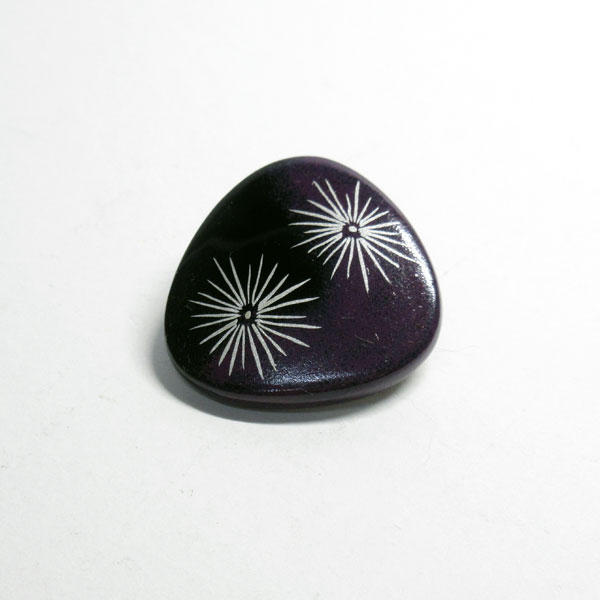 三角形の木製の素地に黒漆を塗り、色漆や銀粉などで加飾をしたブローチです。木製木地のため、垂れ下がったりせず、とても軽やかな付け心地。在庫数はそれぞれ1個ずつ、現品のみです。
