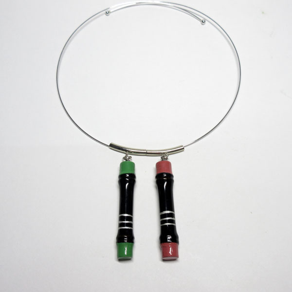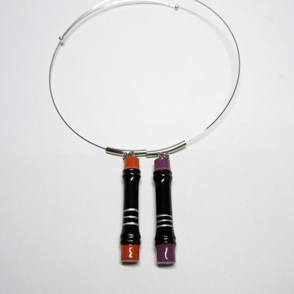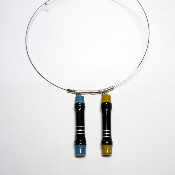 杵形の素地に黒漆と色漆を塗り分け、2つ繋げたチョーカーです。在庫数はそれぞれ1個ずつ、現品のみです。