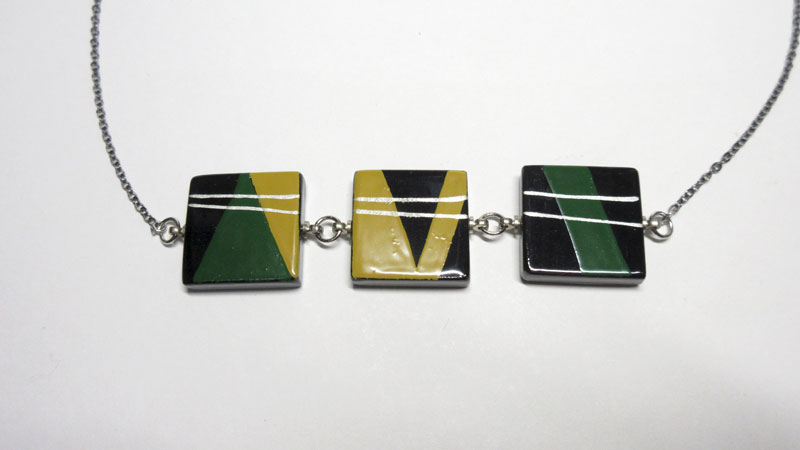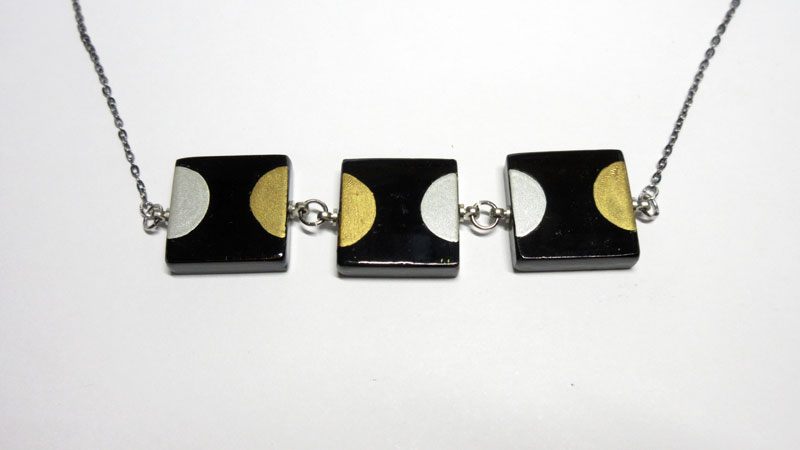 角形の素地に黒漆と色漆を塗り分け、3つ繋げたネックレスです。在庫数はそれぞれ1個ずつ、現品のみです。