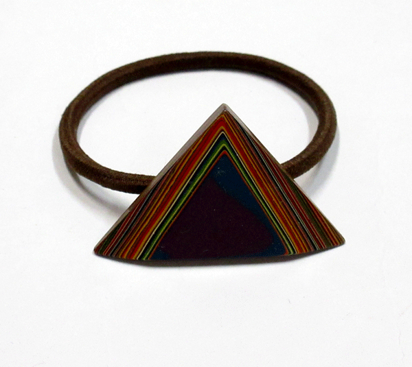 堆漆(ついしつ=色漆を300回以上も塗り重ね、厚く積み重なった漆の層を研ぎ出して、さまざまな模様を出す伝統技法)でつくったヘアゴムです。現在の在庫は、下の4個です。