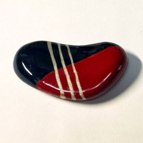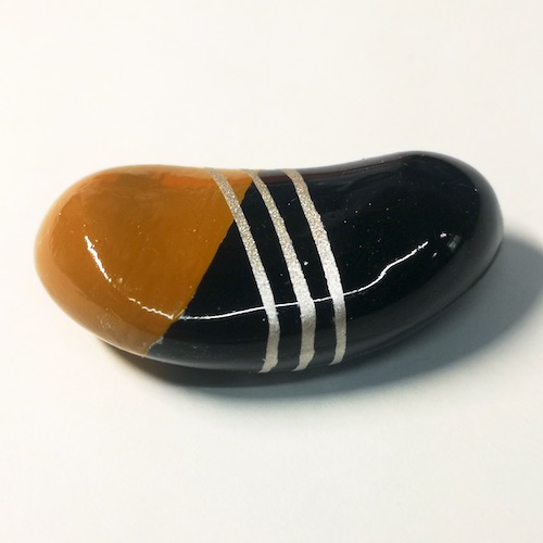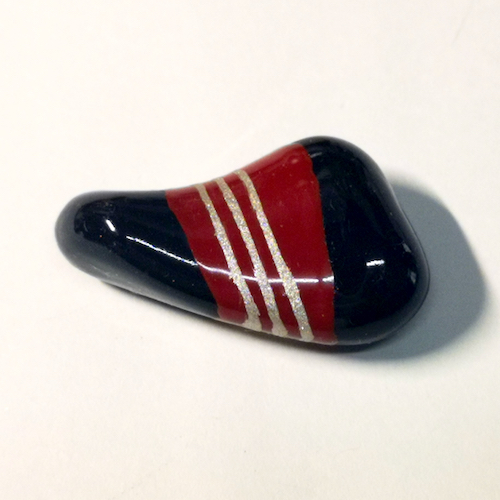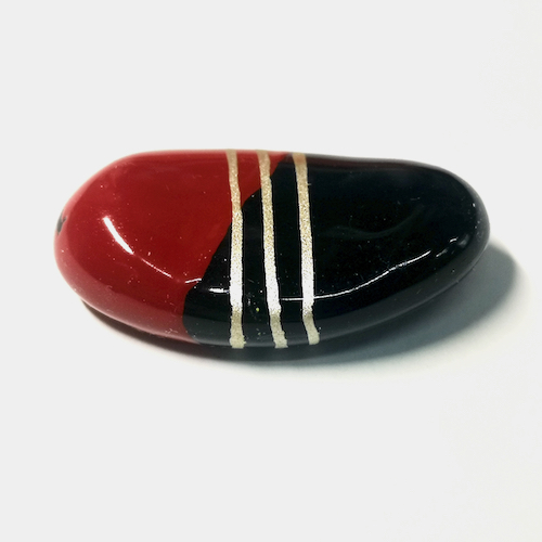 丸石形の樹脂に黒漆を塗り、色漆でアクセントをつけた箸置きです。色は「青」「緑」「紫」「赤」「黄」の5種類です。ひとつひとつ形が違いますので、下の写真でお確かめの上、お選びになったものを、1つずつ「買い物かご」にお入れ下さい。現在の在庫は下の11個です。