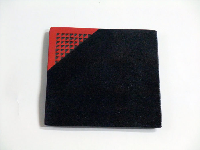 村上木彫り堆朱の技法をコーナーだけに生かした、正方形プレートです。お菓子を盛ったり、コップや急須、小さな花生けを置く台にしたり、工夫次第でいろいろに使えます。表面の黒い部分は、陶器の湯呑みなどを乗せても傷つかないよう、炭粉を蒔き、ざらっぽい仕上げにしています。