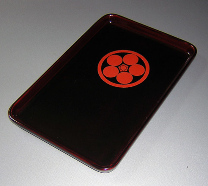 弁柄漆で家紋を入れた、冠婚葬祭用の黒塗りの小盆です。お客様の家紋をお聞きしてお入れします。家紋を入れるのは3日ほどでできます。