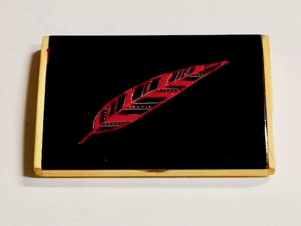 檜(ひのき)の素地を生かし、蓋の表面にのみ黒漆を塗り、文様を線刻して、色漆を摺り入れたカードケース(名刺入)です。標準的な厚さの名刺ですと、約20枚収納できます。安価でありながら、グレードの高さを感じさせる一品です。