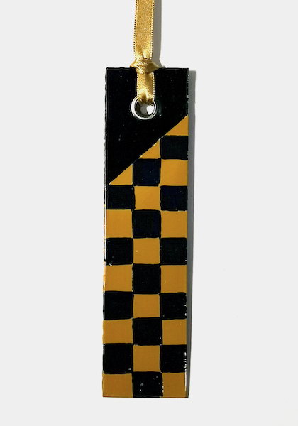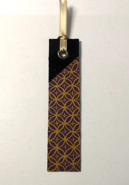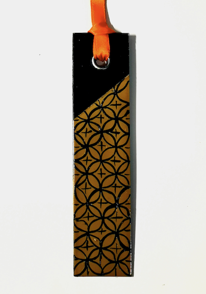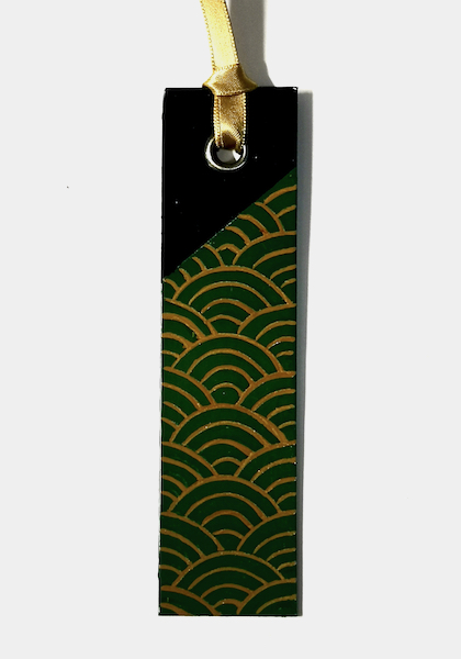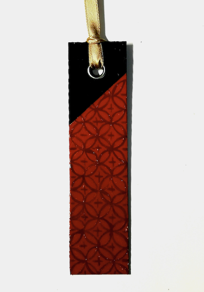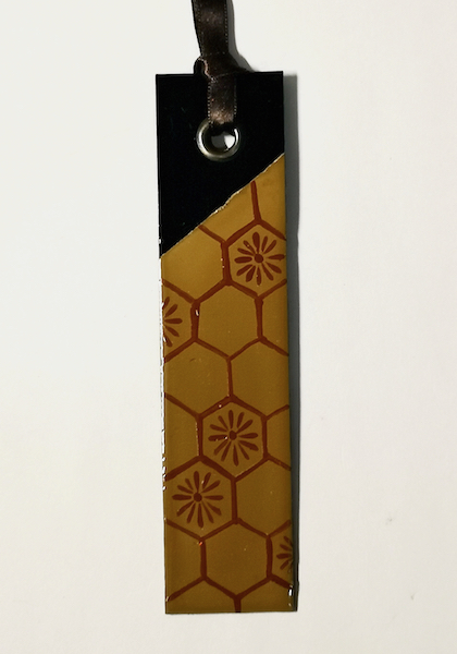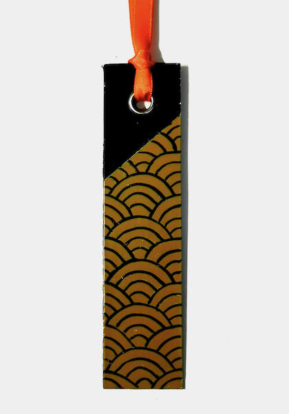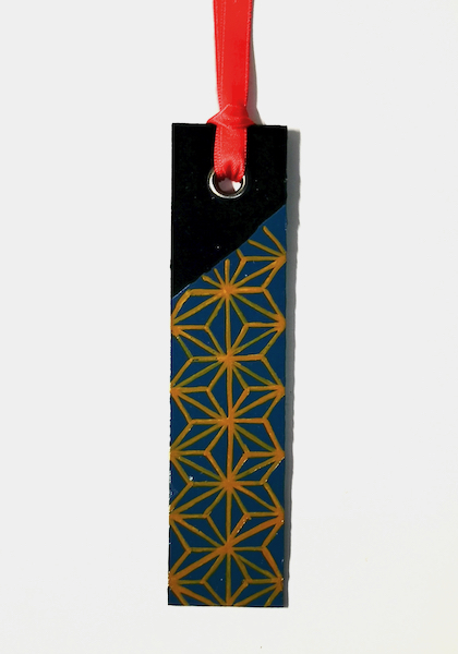 厚紙に、漆で下地を施し、黒漆を塗って、色漆で文様をつけた「しおり」(ブックマーク)です。文様は5種。読書のためのおしゃれなアクセサリーとして、軽いプレゼントにもいかがでしょうか。クリスタル・パック入りです。