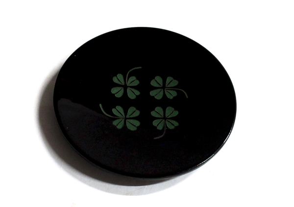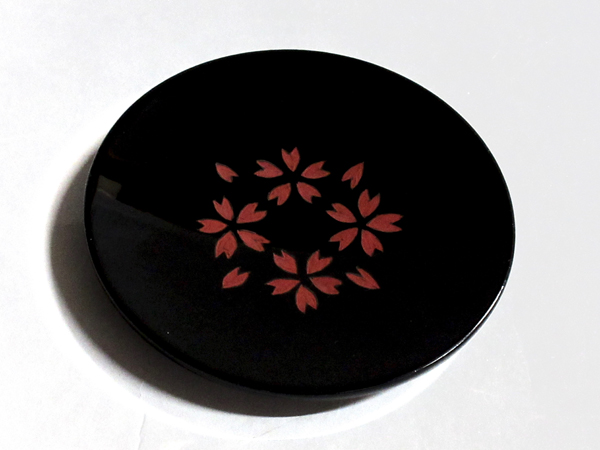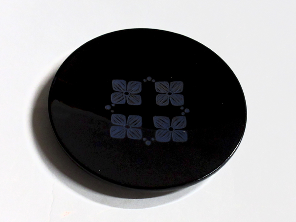 クローバ(緑)、菊(黄)、紫陽花(青紫)、桜(桃色)、雪(白)の銘々皿5枚セットです。それぞれの色漆を塗った上に、黒漆を塗り重ねて磨き、文様に沿って彫刻刀で色を彫り出したもの。春夏秋冬の文様を5種組み合わせてみました。