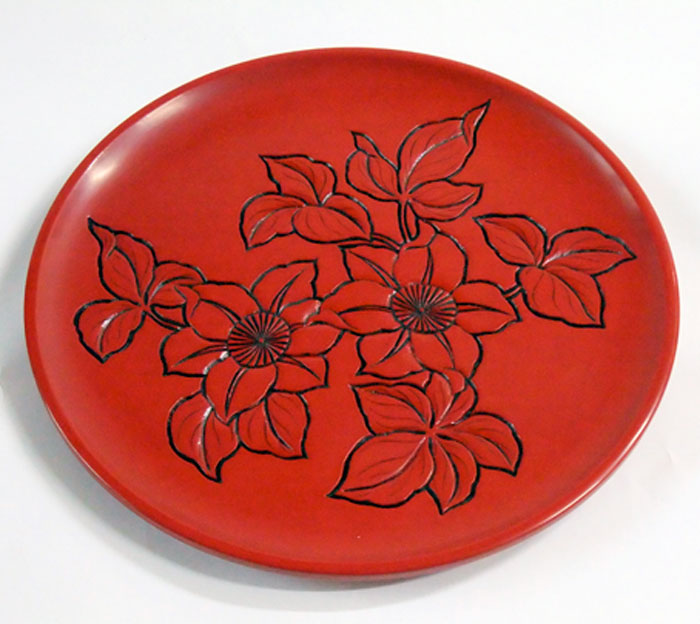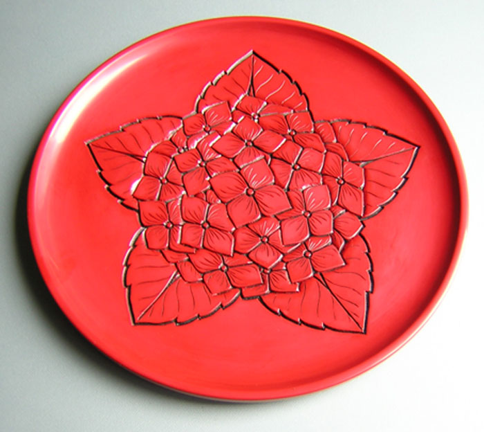 村上木彫堆朱の伝統的技法でつくられた九寸丸盆。図柄は、URUSHI OHTAKIのオリジナルの「あじさい」「てっせん」の2種です。