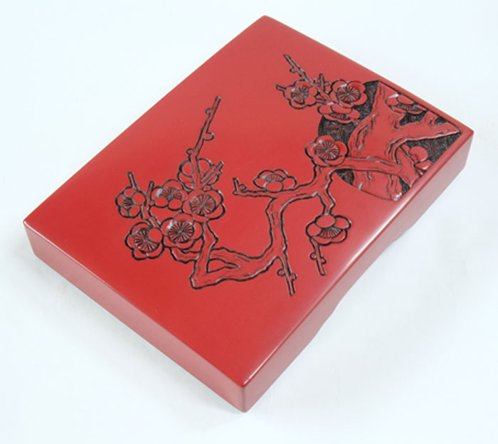 図柄は「梅樹」で、一部地を引き下げ、細かな地紋を施してあります。中に黒漆塗りの敷板が入り、それを硯の形に刳り抜くことで、硯を固定することもできます。この製品は桐箱入りです。