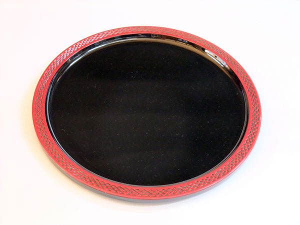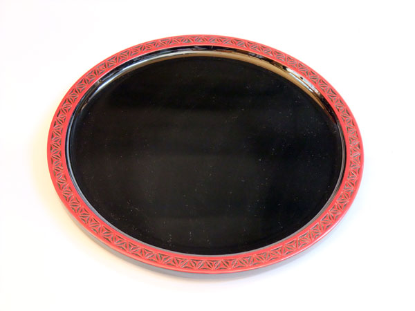 縁周りだけに、村上堆朱の彫り文様を施し、朱と黒の引き締まった対比が美しい24センチ径の皿です。美しい黒漆の艶が盛りつけた果物や菓子類を引き立て、周囲の堆朱部分が華やかで格調の高い気分を演出します。「幾何文」「麻の葉文」の2種類がございます。