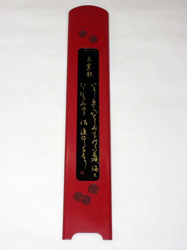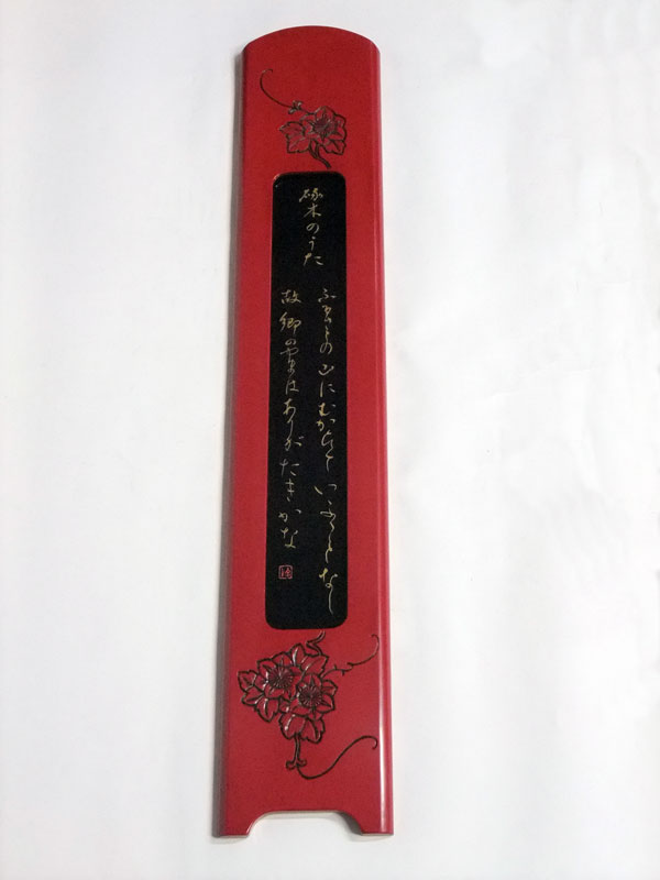 柱などにかける堆朱の短冊掛です。文様は、てっせん・梅・小菊の3種類。裏板に漆で和歌が書いてあり、短冊を入れずともそのまま掛けられます。