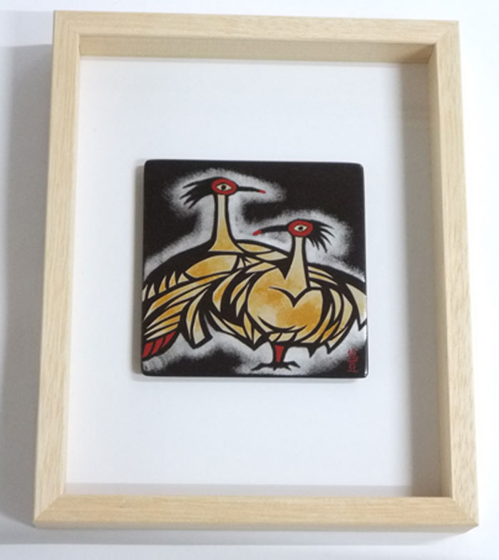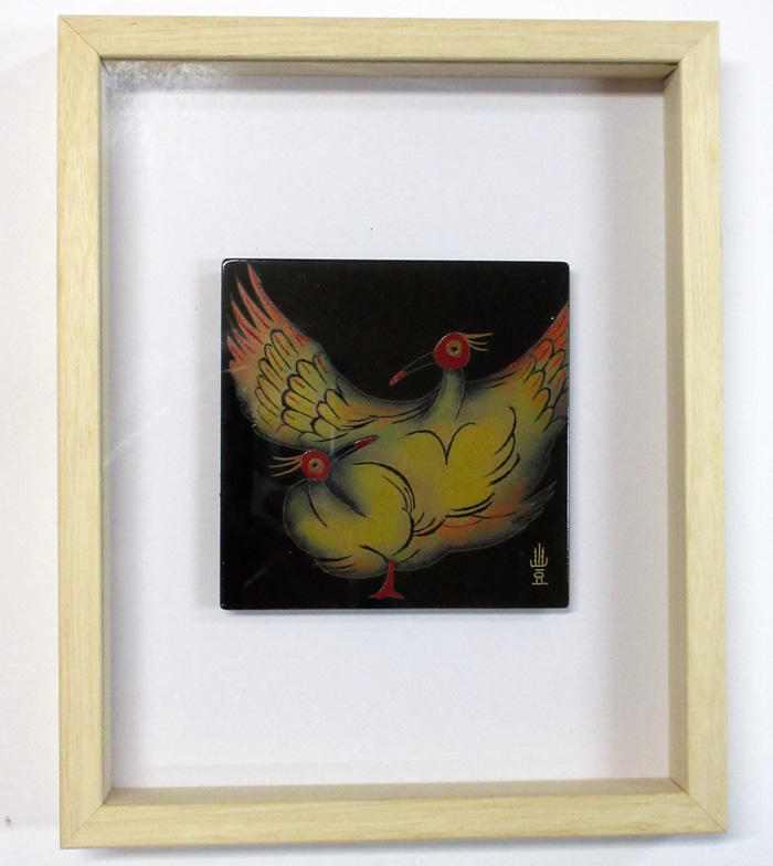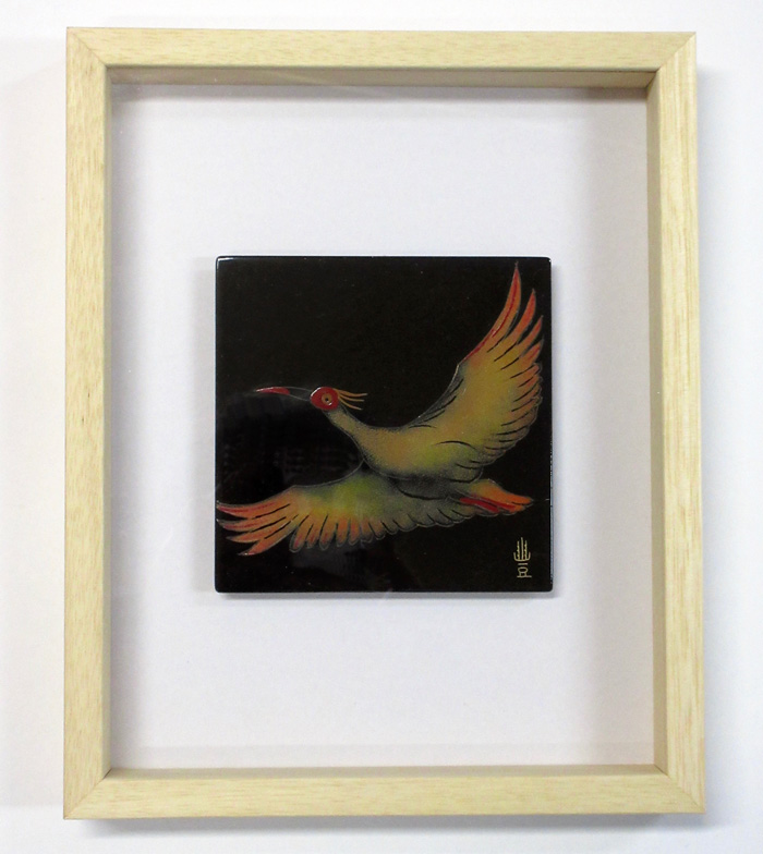 黒漆を塗った12センチ角のプレートに、国の天然記念物で新潟に縁の深い朱鷺を、色漆を使って構成的に表現した小額です。
